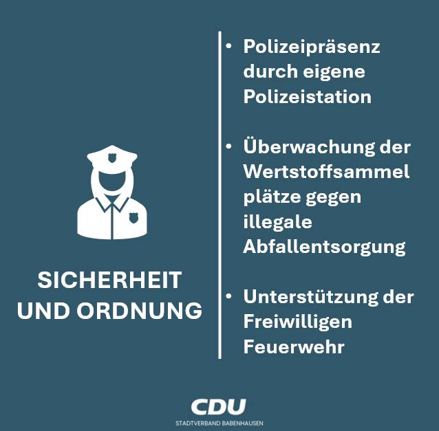 mehrPolizei und kommunale Ordnungskräfte schätzen die Bürgerinnen und Bürger vor Kriminalität, Gewalt und treten wirksam der Vermüllung und der Umweltverschmutzung entgegen.Sicherheit und Ordnung - unsere Ziele:? Wir fordern mehr Polizeipräsenz durch eine neue eigene Polizeistation in Babenhausen in Kooperation mit den angrenzenden Kommunen Schaafheim, Eppertshausen und Münster? Wir fordern eine Überwachung der Wertstoffsammelplätze gegen illegale Abfallentsorgung und die konsequente Ermittlung der Verursacher.? Wir unterstützen die ehrenamtliche Arbeit der Einsatzabteilungen der Freiwilligen Feuerwehren und stehen hinter unserer "Blaulichtfamilie"