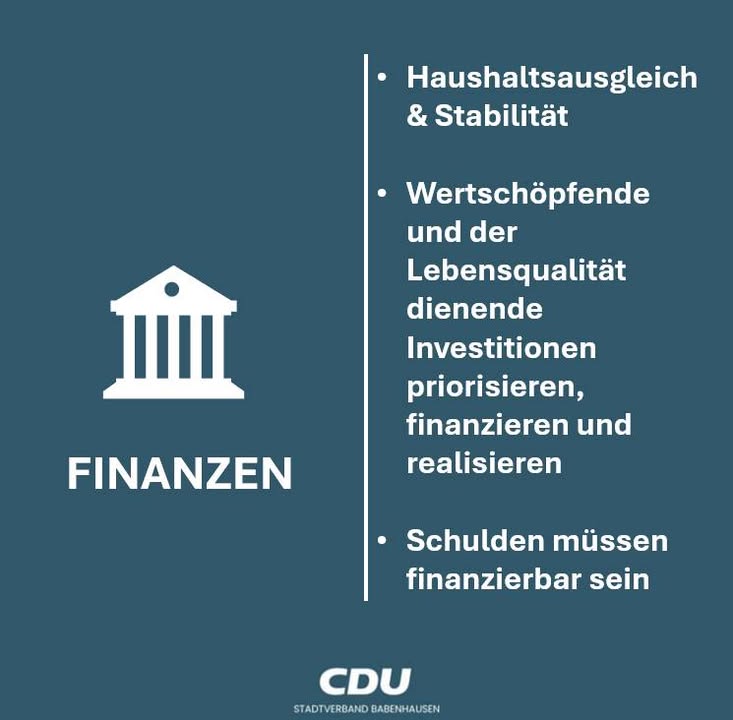 Als CDU Babenhausen haben wir in den vergangenen Jahren viel für unsere Stadt mit allen ihren Ortsteilen erreicht. Darauf sind wir stolz – und darauf bauen wir auf. Mit klaren Zielen, verlässlicher Politik, Bürgernähe und einem starken Miteinander wollen wir diesen erfolgreichen Weg fortsetzen.