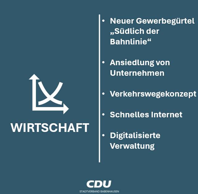 Wirtschaft - unsere Ziele:? Schnelle Entwicklung und Realisierung des neuen Gewerbegürtels "Südlich der Bahnlinie"? Ansiedlung von neuen Gewerbebetrieben und Start-up-Unternehmen? Schaffung der erforderlichen Infrastruktur durch ein zukunftsweisendes Verkehrswegekonzept ? Flächendeckendes, schnelles Internet ? Verkürzung von Entscheidungswegen durch eine effiziente und digitalisierte VerwaltungWir stehen für eine verlässliche Förderung und Unterstützung der Neuansiedlung und der Sicherung der vorhandenen Unternehmen, Gewerbe- und Einzelhandelsbetriebe, denn sie schaffen die Grundlage für Arbeitsplätze und die Einnahmen aus Gewerbesteuern!