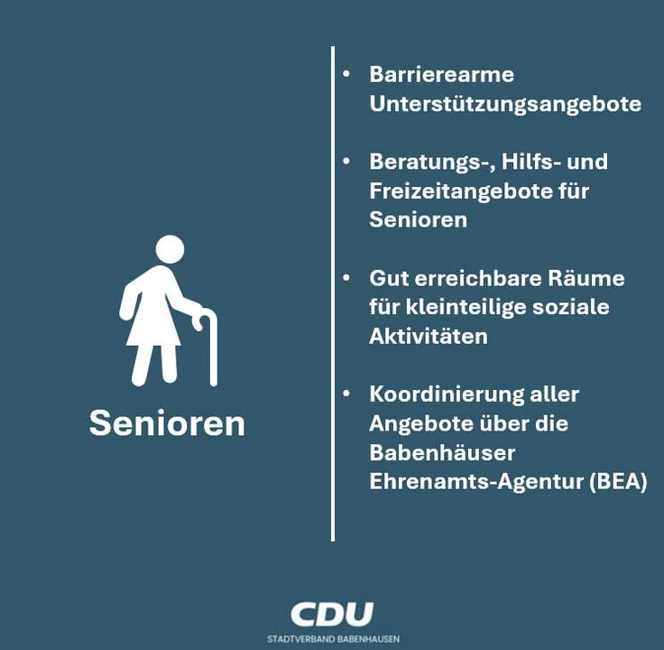 mehrSeniorinnen und Senioren sind ein wichtiger Teil des gesellschaftlichen Lebens in Babenhausen. Sie haben unsere Wertschätzung und Anerkennung für geleistetes verdient. Wir setzen uns für Teilhabe, Selbstständigkeit und soziale Begegnung im Alter einSenioren ? unsere Ziele:? Barrierearme Unterstützungsangebote, insbesondere Transportmöglichkeiten zu Einkäufen und Arztbesuchen, sollen gefördert werden? Beratungs-, Hilfs- und Freizeitangebote für Senioren sollen gebündelt und übersichtlich kommuniziert werden? Gut erreichbare Räume für kleinteilige soziale Aktivitäten wie Treffen, Spiele oder Austausch sollen zur Verfügung stehen? Die Koordinierung aller Angebote soll zentral über die Babenhäuser Ehrenamts-Agentur (BEA) erfolgen
