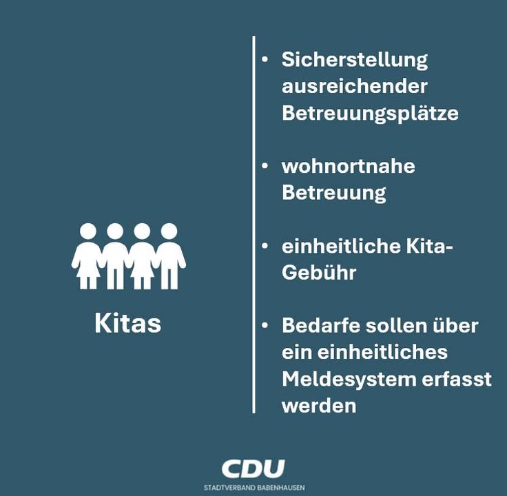 Eine verlässliche und wohnortnahe Kinderbetreuung ist Grundlage für Familienfreundlichkeit und Chancengleichheit in Babenhausen.Kitas ? unsere Ziele:? Wir setzen uns auch weiterhin für die Sicherstellung ausreichender Betreuungsplätze ein.? "Kurze Beine ? kurze Wege" bleibt Leitlinie für eine wohnortnahe Betreuung? Wir befürworten eine einheitliche Kita-Gebühr.? Bedarfe sollen über ein einheitliches Meldesystem erfasst werden ? sowohl in Kitas als auch bei Tagespflegepersonen