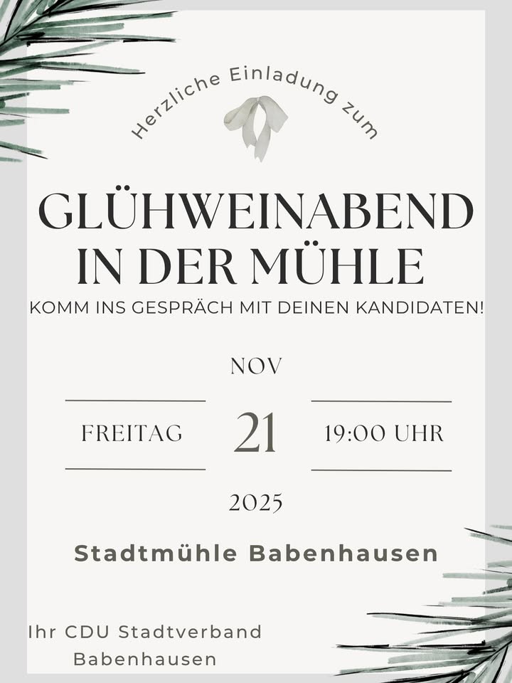 mehrDie CDU Babenhausen lädt herzlich zum Glühweinabend in der Stadtmühle ein Am Freitag, den 21. November 2025 ab 19 Uhr, findet in der Stadtmühle Babenhausen ein vorweihnachtlicher Abend mit Glühwein und kleinen Leckereien statt.Im Rahmen dieser Veranstaltung haben interessierte Bürgerinnen und Bürger die Möglichkeit, in gemütlicher Atmosphäre mit den Kandidatinnen und Kandidaten der Kommunalwahl ins Gespräch zu kommen und politische Themen, Fragen und Anliegen direkt anzusprechen.Wir freuen uns auf Euch!