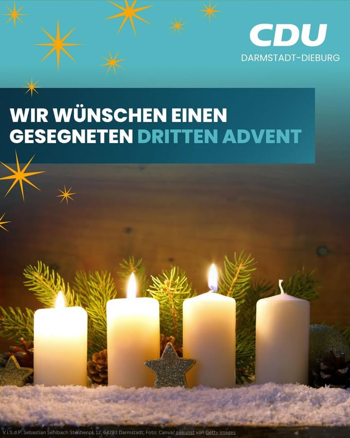 mehr***3. Advent *** 🕯️Die CDU Darmstadt-Dieburg wünscht einen gesegneten 3. Advent - für Sie und Ihre Liebsten.Möge dieser Sonntag Ihnen Ruhe, Licht und Hoffnung schenken. 🕯️✨#3Advent #Adventssonntag #Adventszeit#CDUDarmstadtDieburg #Besinnlichkeit