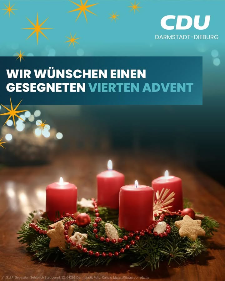 mehr🌟 4. Advent 🌟 Die CDU Darmstadt-Dieburg wünscht einen gesegneten 4. Advent - für Sie und Ihre Liebsten.Möge dieser Sonntag Ihnen Ruhe, Licht und Hoffnung schenken.#4Advent #Adventssonntag #Adventszeit #CDUDarmstadtDieburg #Besinnlichkeit