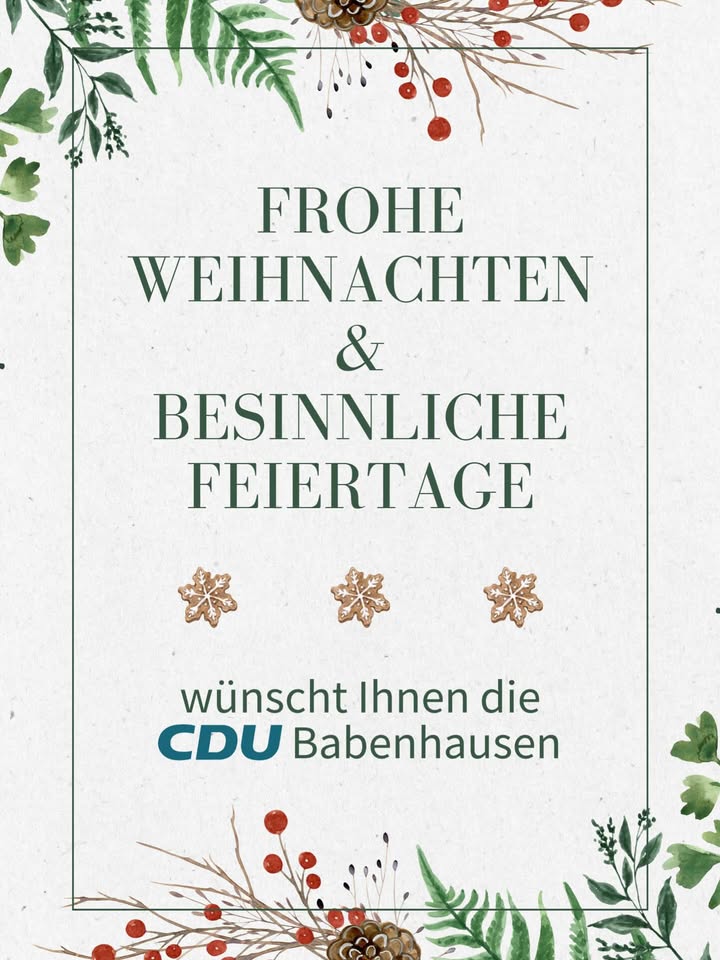 Die CDU Babenhausen wünscht Euch und Euren Familien ein besinnliches Weihnachtsfest voller Frieden, Harmonie und erholsamer Momente 🎄✨