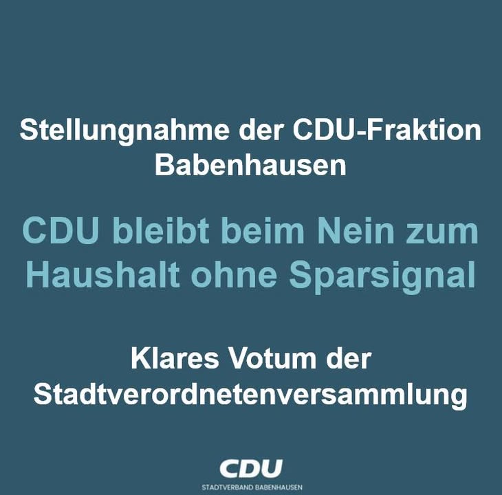 Stellungnahme der CDU-Fraktion BabenhausenCDU bleibt beim Nein zum Haushalt ohne SparsignalKlares Votum der StadtverordnetenversammlungDer Haushaltsentwurf des Bürgermeisters für 2026 stößt bei der CDU-Fraktion in der Stadtverordnetenversammlung weiterhin auf Ablehnung. Nachdem der Etat sowohl im Finanzausschuss als auch in der Stadtverordnetenversammlung ohne eine einzige Ja-Stimme abgelehnt wurde, sieht die CDU darin ein deutliches Signal für eine Nachbesserung."Dieses Votum hätte als Auftrag verstanden werden müssen, den Haushalt zu überarbeiten und mehrheitsfähig zu machen", erklärt die CDU-Fraktion. Stattdessen habe der Bürgermeister Widerspruch gegen den Beschluss der Stadtverordnetenversammlung eingelegt.Keine Zustimmung ohne klare BedingungenGrundsätzlich könne die CDU einem Haushalt nur unter klar definierten Voraussetzungen zustimmen. "Eine weitere Erhöhung der bereits beschlossenen Grundsteuer B kommt für uns nicht infrage. Gleichzeitig erwarten wir, dass innerhalb der Verwaltung Einsparpotenziale konsequent genutzt und umgesetzt werden", betont die Fraktion.Sach- und Dienstleistungen im FokusBesonders kritisch bewertet die CDU den Ansatz für Sach- und Dienstleistungen. Während diese Ausgaben im Jahr 2024 noch bei 7,7 Millionen Euro lagen, sind für 2026 Ausgaben in Höhe von 10,1 Millionen Euro vorgesehen. Ein Anstieg um mehr als 31 Prozent. Nach den von der CDU eingebrachten und bereits mehrheitlich beschlossenen Änderungsanträgen wäre es nach Darstellung der Fraktion ausreichend, den Ansatz auf 8,7 Millionen Euro zu reduzieren, um einen genehmigungsfähigen Haushalt zu erreichen.Keine Einschnitte bei Personal, Investitionen und Sozialem"Dabei müssten weder Personalstellen abgebaut noch Investitionen oder soziale Leistungen gekürzt werden", argumentiert die CDU-Fraktion. Alle bestehenden Stellen im Rathaus könnten erhalten bleiben, ebenso die geplanten Investitionen.Appell zu verantwortungsvollem Umgang mit SteuergeldernAngesichts der angespannten finanziellen Lage vieler Bürgerinnen und Bürger warnt die CDU davor, kommunale Haushaltsprobleme einseitig über Steuererhöhungen zu lösen. Auch vor dem Hintergrund schwieriger werdender finanzieller Rahmenbedingungen für die Kommunen sei ein sorgfältiger und verantwortungsvoller Umgang mit den vorhandenen Mitteln erforderlich.