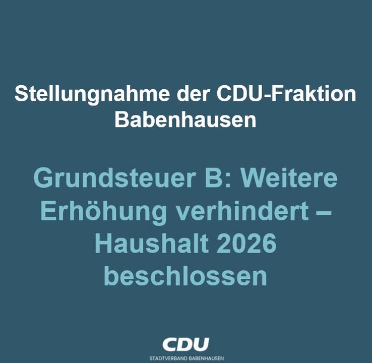 Stellungnahme der CDU-Fraktion BabenhausenGrundsteuer B: Weitere Erhöhung verhindert ? Haushalt 2026 beschlossenSteuerbescheide bereits versandt ? rückwirkende Erhöhung ist vom TischVor wenigen Tagen haben die Bürgerinnen und Bürger der Stadt ihre Grundsteuerbescheide erhalten. Diese basieren auf dem zuletzt beschlossenen Hebesatz von 645 v. H. In der vom Bürgermeister beantragten Adhoc-Stadtverordnetenversammlung am letzten Donnerstag, stand dennoch kurzfristig eine weitere Anhebung der Grundsteuer B zur Entscheidung, die rückwirkend zum 1. Januar 2026 wirksam werden sollte.Der vom Bürgermeister eingebrachte Antrag sah vor, den Hebesatz von 645 v. H. auf 925 v. H. anzuheben, ohne jegliche Begründung.Eine solche Entscheidung hätte eine nachträgliche Anpassung der bereits versandten Steuerbescheide und entsprechende Nachforderungen zur Folge gehabt. Bei einem beispielhaften Messbetrag von 100 Euro hätte sich die jährliche Grundsteuer von 645 Euro auf 925 Euro erhöht.Keine Mehrheit für weitere Erhöhung der Grundsteuer BDie Stadtverordnetenversammlung hat diese weitere Erhöhung abgelehnt. Damit bleibt es beim bestehenden Hebesatz von 645 v. H. Mit der Entscheidung gegen eine erneute Steuererhöhung blieb die Aufgabe bestehen, den Haushalt 2026 genehmigungsfähig auszugestalten. Nach den zuvor gefassten Beschlüssen fehlten hierfür weiterhin rund 1,4 Millionen Euro.Reduzierung bei Sach- und Dienstleistungen beschlossenZur Schließung dieser Lücke brachte CDU-Fraktionsmitglied Günther Eckert einen Änderungsantrag ein, der eine Reduzierung des Ansatzes für Sach- und Dienstleistungen von 10,1 Millionen Euro auf 8,7 Millionen Euro vorsah. Dieser Antrag wurde beschlossen. Der neue Ansatz entspricht dem Haushaltsansatz des Jahres 2025 und liegt weiterhin rund eine Million Euro über dem tatsächlichen Aufwand des Jahres 2024.Haushalt 2026 mehrheitsfähig verabschiedetDurch diese Anpassung konnte der Haushaltsplan 2026 insgesamt ausgeglichen und mehrheitsfähig beschlossen werden. In der abschließenden Abstimmung fand der Haushalt die erforderliche Mehrheit in der Stadtverordnetenversammlung. Nun liegt es an der Kommunalaufsicht zu prüfen, ob der beschlossene und angepasste Haushaltsentwurf genehmigt wird.
