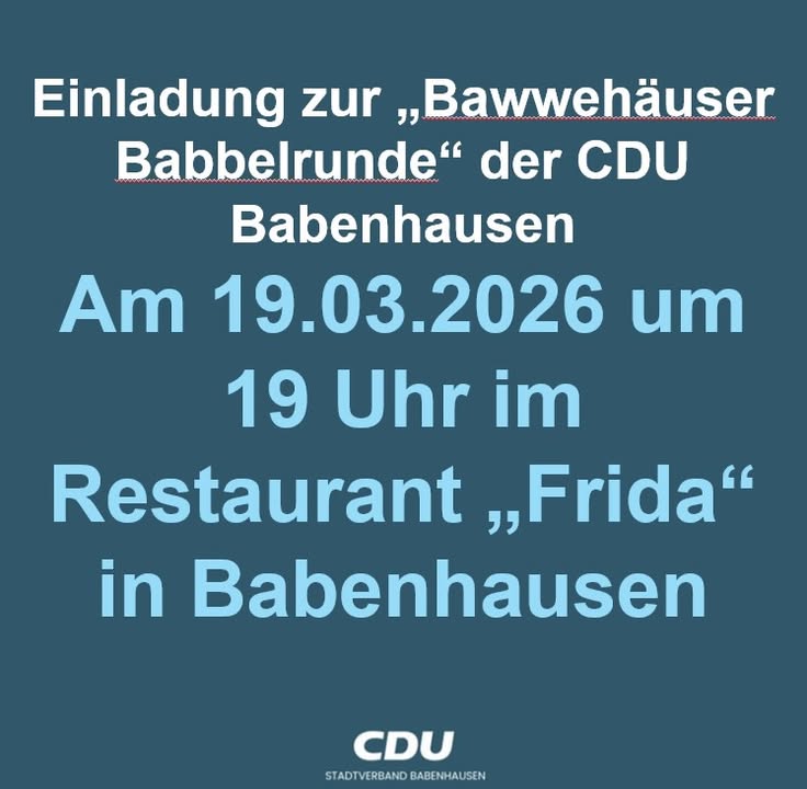 mehrEinladung zur BawwehäuserBabbelrundeDer CDU-Stadtverband Babenhausen lädt Euch herzlich zur Bawwehäuser Babbelrunde am Donnerstag, den 19. März 2026, um 19 Uhr ein. In einer geselligen Atmosphäre des Restaurants "Frida" in Babenhausen möchten wir gemeinsam mit Euch aktuelle kommunal-, landes- und bundespolitische Themen besprechen - und natürlich all das, was Euch sonst bewegt.Kommt vorbei, bringt Eure Fragen und Ideen mit und lasst uns einen anregenden Abend miteinander verbringen!Wir freuen uns auf Euch!
